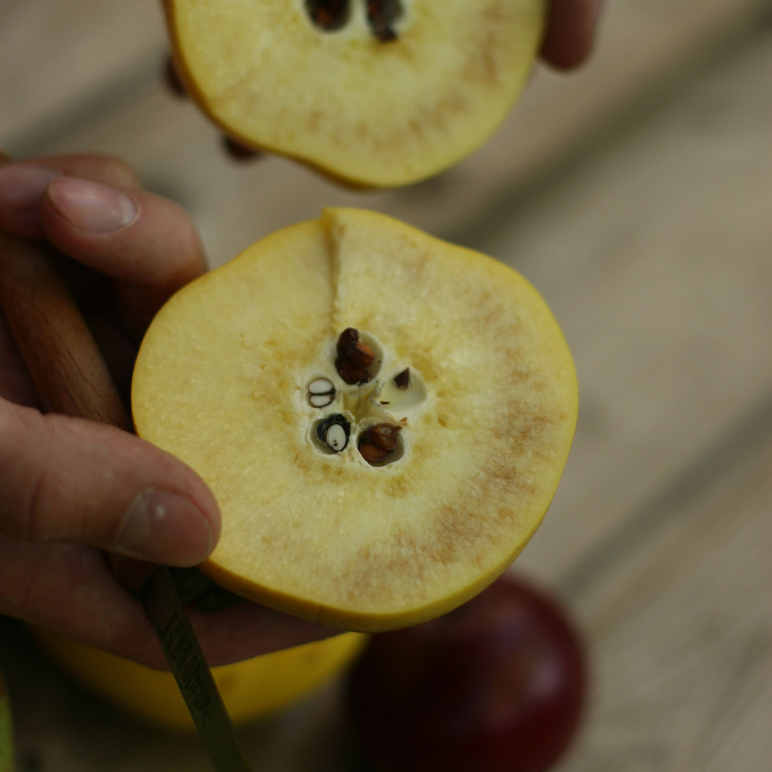 In der Apfelquitte ist kein Apfel enthalten. Der Name „Apfelquitte“ bezieht sich auf ihre Form, da diese rund und apfelförmig ist. Somit ist Apfelquitte eine eigenständige Frucht und vor allem geschmacklich stark von Äpfeln differenziert.